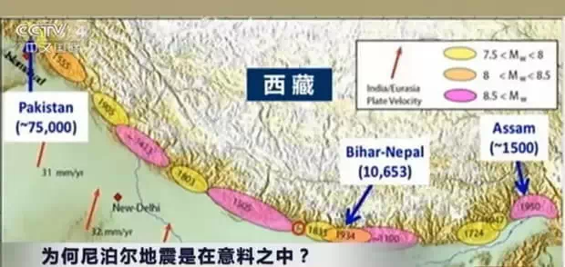 尼泊尔位于喜马拉雅山的南麓,恰好位于印度板块和亚欧板块的边界上,印度板块以一定的速度向亚欧板块运动,而曾经喜马拉雅山脉就是在这种作用下形成的。历史上,沿这条边界发生的地震非常多,震级也很大。