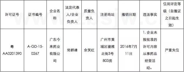 8月2日,CFDA官方网站连续发布几条撤销GSP认证证书的公告。公告显示,广东今来药业有限公司、广东保康药业有限公司、中山东洲药业有限公司、广州众维药业有限公司、广州市沃克贸易有限公司、广东瀚邦药业有限公司6家企业严重违反《药品经营质量管理规范》规定,依据《药品经营质量管理规范认证管理办法》第四十五条,依法撤销其《药品经营质量管理规范认证证书》,并根据《广东省食品药品监督管理局药品生产经营单位信用分类管理的实施办法》(粤食药监法〔2014〕109号)规定,评定其信用等级为“严重失信”。