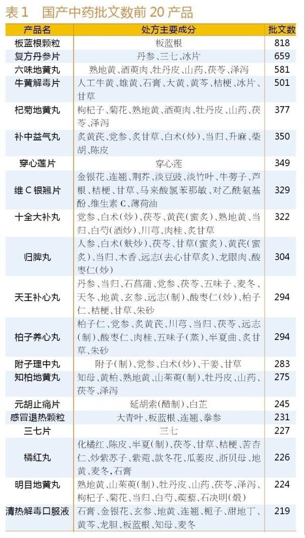 从表1可以看出,目前国产中药批文数前20的产品对应的批文数都超过200个,可见中药特别是中药口服药生产批文的重复申报问题也非常严重。20个产品中,有3个是单方产品,其余17个都是复方,其中最经典的方且批文数较多就是始见于宋《小儿药证直诀》的六味地黄丸。