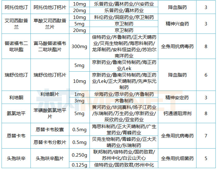 从治疗类别看,糖尿病用药、全身用抗细菌药、全身用抗病毒药、降血脂药等4个类别均有2个品种过评企业达3家。 从过评企业数看,二甲双胍、替诺福韦二吡呋酯、氨氯地平、恩替卡韦是过评企业数最多的品种,分别为10家、8家、8家、7家。 17个品种中,有10个品种为“4+7”带量采购品种,7个品种有望纳入第二批带量采购,分别为二甲双胍、阿莫西林、格列美脲、碳酸氢钠、聚乙二醇、左西替利嗪、异烟肼,相关过评药品均为国家医保药品,其中盐酸二甲双胍缓释片和盐酸左西替利嗪片为乙类药品,其它均为甲类药品。 过评企业达3家的非“4+7”品种