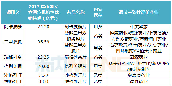 两大糖尿病用药成集采热点 值得关注的是,第一批25个“4+7”品种中,没有糖尿病用药品种被纳入集采。据米内网数据,目前糖尿病用药通过一致性评价的通用名品种有6个。其中,阿卡波糖、二甲双胍、瑞格列奈、格列美脲等4个品种2017年在中国公立医疗机构终端销售额均超过20亿元,是糖尿病患者的主要用药品种。可以预见,糖尿病用药将是第二轮带量采购的重点。 二甲双胍、格列美脲的过评企业分别有10家、4家,阿卡波糖、瑞格列奈、沙格列汀、维格列汀等4个品种均只有一家企业通过一致性评价。可见,在第二批带量采购中,二甲双胍、格列美脲将面临一场激烈的价格战。 糖尿病用药通过一致性评价产品