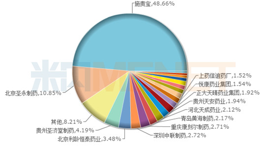 据米内网数据,2017年中国公立医疗机构终端二甲双胍销售额为36.59亿元,原研厂家施贵宝占据48.66%的市场份额。目前盐酸二甲双胍胶囊、盐酸二甲双胍片、盐酸二甲双胍缓释片等三个产品还各有1家、24家、7家企业申报一致性评价在审中。 2017年中国公立医疗机构终端二甲双胍品牌格局