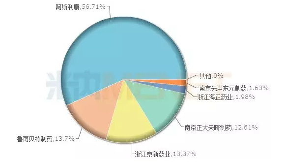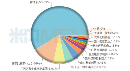 2017年中国公立医疗机构终端格列美脲销售额为36.59亿元,原研厂家赛诺菲占据58.69%的市场份额。销售TOP5企业中,扬子江药业、万邦生化、新华制药的产品均已通过一致性评价。石药欧意占据格列美脲12.96%的市场份额,但未申报该产品的一致性评价。 2017年中国公立医疗机构终端格列美脲品牌格局