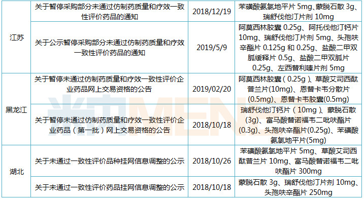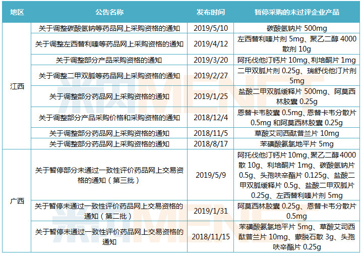 一致性评价成刚需,未过评药品被“抛弃 ” 根据国务院办公厅《关于开展仿制药质量和疗效一致性评价的意见》,通过一致性评价的药品品种,在医保支付方面予以适当支持,医疗机构应优先采购并在临床中优先选用。同品种药品通过一致性评价的生产企业达到3家以上的,在药品集中采购等方面不再选用未通过一致性评价的品种。 在“4+7”带量采购执行效果超预期,第二批带量采购品种即将公布的情况下,未过评与未中选产品企业在医疗机构招标采购与零售市场的销售中面临着越来越大的阻力。近期,江西、广西、江苏等多个省份的药品招采平台相继发布公告,对“未通过一致性评价,且已有其他3家企业通过一致性评价”药品生产企业暂停网上采购资格。 各省份暂停挂网采购的未过评企业产品