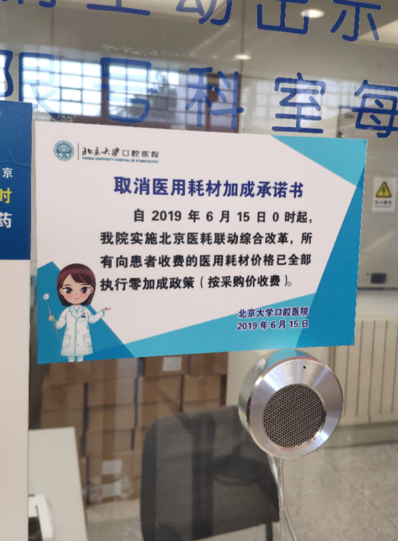论是耗材零加成,还是高值耗材的带量采购,国家对该领域的重点管控都已成了不争的事实。 取消耗材加成政策落地 北京市政府宣布于6月15日零时在北京市推开医耗联动综合改革,全市近3700所医疗机构按医用耗材进价收费。这也是北京在取消以药养医后,将再次告别以耗养医。 对于政策的落地与执行情况,赛柏蓝器械选择了在耗材上消耗量相对较大的牙科医院进行探访,在北京大学口腔医门诊的挂号与收费窗口处看到,玻璃上张贴着《取消医用耗材加成承诺书》。