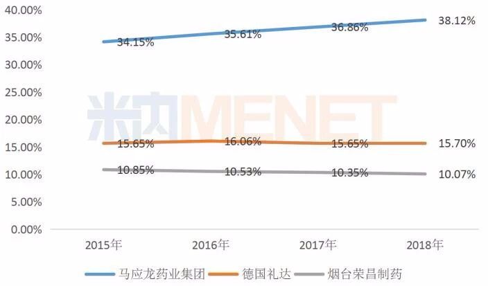 (来源:上市公司年报) 马应龙主要聚焦肛肠治痔领域,重点产品包括了马应龙麝香痔疮膏、麝香痔疮栓、痔炎消片、金玄痔科熏洗散等,最近几年该公司的痔疮类产品营收增速较快,从2015年的5.83亿元上涨至2018年的8.16亿元,毛利率保持在70%以上。 图2:2018年中国城市零售药店终端中成药痔疮用药TOP3企业市场份额