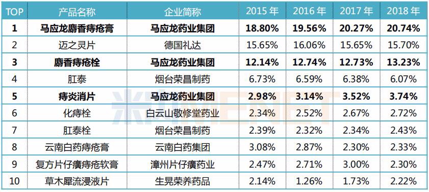 (来源:米内网中国城市零售药店终端竞争格局) 马应龙的痔疮用药主战场在零售药店。据米内网数据显示,在2018年中国城市零售药店终端中成药痔疮用药市场中,市场份额超过10%的企业有三家,马应龙以接近四成份额遥遥领先于德国礼达以及烟台荣昌制药。 表1:中国城市零售药店终端中成药痔疮用药品牌排名TOP10市场份额