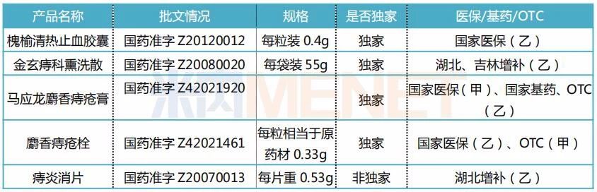 (来源:米内网中国城市零售药店终端竞争格局) 据米内网数据显示,在中国城市零售药店终端中成药市场中,痔疮用药的市场规模逐年上涨,2018年涨至15.47亿元。 TOP10品牌中,马应龙占了3个席位,其中马应龙麝香痔疮膏为独家品种,国家医保甲类、国家基药、OTC产品,最近几年一直保持在榜首位置,2017年起市场份额突破20%,2018年涨至20.74%。麝香痔疮栓为独家品种,国家医保乙类、OTC产品,最近几年的市场份额保持在12%~13%左右。痔炎消片的生产企业有两家,仅入了湖北省的医保增补目录,马应龙的市场份额超过99%。 新品驾到!第二代马应龙麝香痔疮膏已获批临床 表2:马应龙痔疮用药产品情况