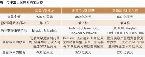 2019年,全球医药收购风生水起,跨国药企的大型收购案先后有:武田(Takeda)以620亿美元收购夏尔(Shire)、百时美施贵宝(BMS)以950亿美元收购新基(Celgene)、艾伯维(AbbVie)以630亿美元收购艾尔健(Allergan)。仅以上三大交易就已超过2018年全年医药购并交易总额。