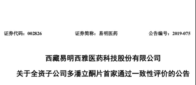 9月9日,易明医药发布公告称,旗下全资子公司维奥制药,于近日获得国家药监局核准签发的化学药品“多潘立酮片”《药品补充申请批件》,首家通过该品种的仿制药质量和疗效一致性评价。