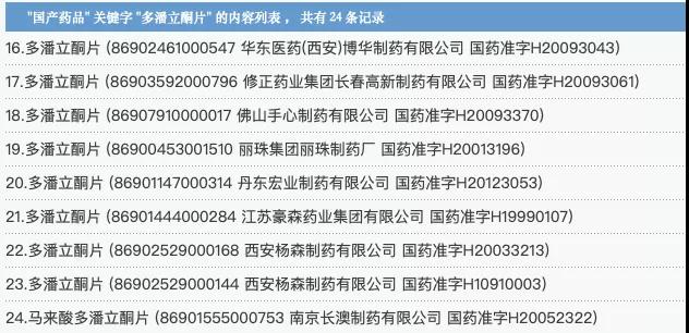 国家药监局药品数据库显示,多潘立酮片的国产批文有24条,修正药业集团长春高新制药、丽珠集团丽珠制药厂、江苏豪森、西安杨森、上海信宜天平药业、辰欣药业、辅仁药业、湖南千金湘江药业、海南制药厂、常州制药厂、山西好医生药业等知名药企均持有该药批文。