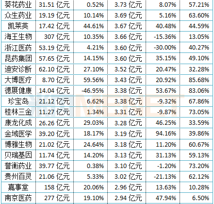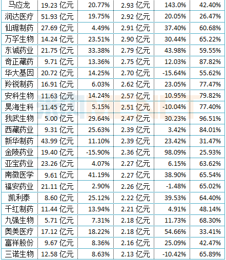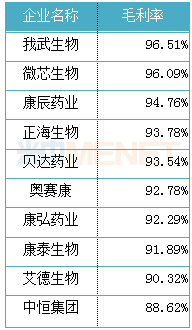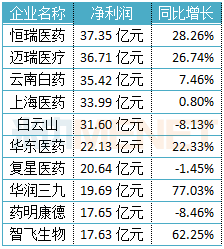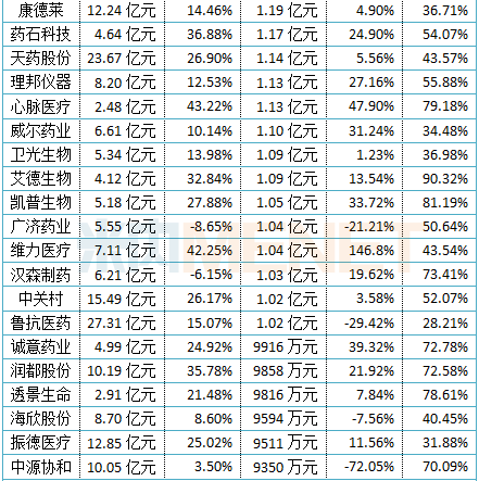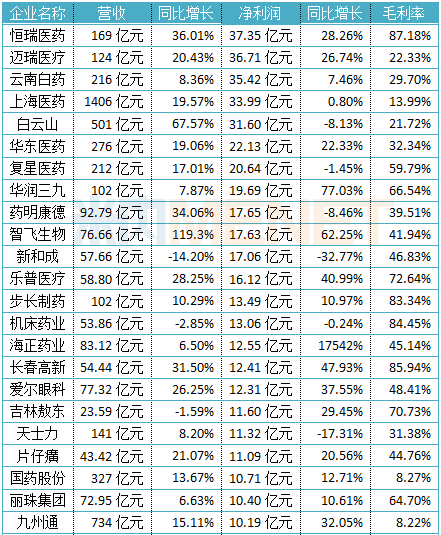 净利润TOP10药企中,恒瑞医药、迈瑞医疗、云南白药、上海医药、白云山5家均超过30亿元。其中,恒瑞医药以37.35亿元位居首位;华润三九和智飞生物增速均超过50%。 恒瑞医药:今年前三季度,恒瑞医药实现营收169.45亿元,同比增长36.01%;净利润为37.35亿元,同比增长28.26%。业绩快速增长离不开其持续的研发投入,前三季度研发费用高达28.99亿元,同比增长超过60%,单是第三季度研发费用14.15亿元,同比增长90.96%。日前,恒瑞医药与Novaliq公司达成协议,引进其用于治疗干眼症的药物CyclASol™(0.1%环孢素A制剂)和NOV03(全氟己基辛烷),恒瑞医药将获得这两个产品在中国的临床开发、生产和市场销售的独家权利。 迈瑞医疗:前三季度净利润达36.71亿元,同比增长26.74%。对于业绩增长,迈瑞医疗表示,1-9月,公司经营规模不断扩大,品牌影响力持续增强,主营业务核心产品市场占有率稳步提升,新兴业务持续发力高速增长。同时公司加强内部管理,经营效益得到进一步提高,确保了公司营业收入和净利润持续增长。预计2019年全年公司营业收入158亿-172亿元,同比增长15%-25%;净利润45亿-48亿元,同比增长20%-30%。值得一提的是,作为医械龙头企业,迈瑞医疗的市值仅次于恒瑞医药,截至11月8日收盘,市值2364亿元。 毛利率TOP10:9家药企均超90% 医药企业2019年前三季度毛利率TOP10