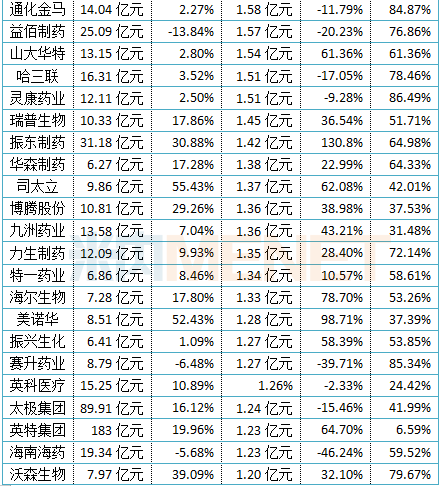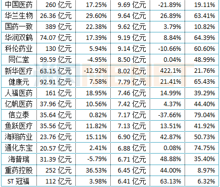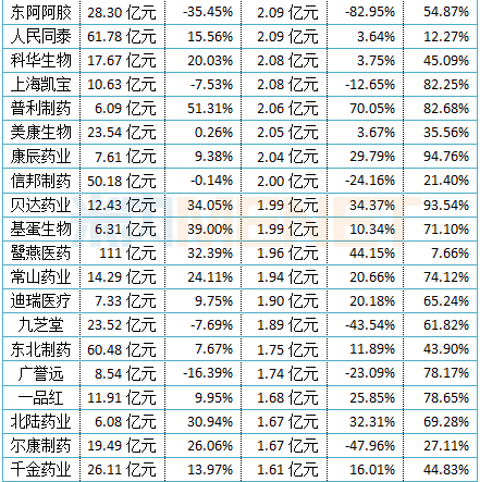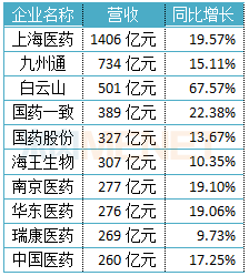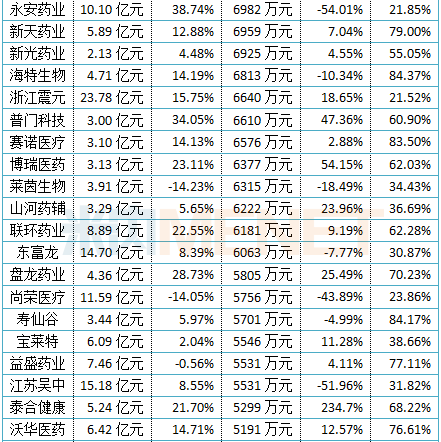 毛利率TOP10药企中,我武生物、康辰药业、贝达药业、奥赛康、康弘药业等9家毛利率均超过90%,其中,我武生物高达96.51%;奥赛康则凭借着借壳上市,跻身到TOP10;微芯生物则是唯一一家进入前十的科创板企业。 我武生物:2019年前三季度营收达5.00亿元,同比增长29.64%;净利润2.47亿元,同比增长30.23%;毛利率高达96.51%。我武生物表示,业绩增长的主要原因是公司积极开拓市场,各项业务进展顺利,营业收入持续较快增长;公司提升管理效率,优化成本费用。今年9月底,我武生物收到《关于黄花蒿花粉变应原舌下滴剂注册现场检查通知》,该通知表明我武生物注册申报品种“黄花蒿花粉变应原舌下滴剂”的注册工作取得了一定进展,待该产品正式获批上市后将进一步丰富公司的产品梯队,增强竞争力,强化公司市场地位。 奥赛康:2019年前三季度营业收入35.36亿元,同比增长19.42%;净利润5.86亿元,同比增长21.40%;毛利率92.78%。去年12月,东方新星完成重大资产重组后,将证券简称变更为奥赛康。据资料显示,奥赛康主要产品有消化类和抗肿瘤类,2018年这两大品类毛利率分别为94.00%、91.05%。10月,奥赛康发布公告称,公司子公司江苏奥赛康药业有限公司与中国医学科学院医药生物技术研究所签订了《技术开发合同》,共同开发治疗多种革兰氏阴性耐药菌感染的创新项目AL0912,子公司将获得该项目在全球的临床开发、注册、生产和市场销售的独家权利,引进该项目将进一步巩固和加强公司耐药菌感染产品线。奥赛康表示,借助科研院所强大的研发实力和平台优势增强公司及子公司的技术研发实力,为相关产品的生产奠定关键技术基础,有利于培育公司新的经济增长点,进一步提高公司核心竞争力。 营收TOP10:上海医药、九州通等6家超300亿 医药企业2019年前三季度营收TOP10