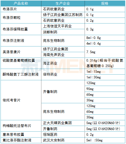 日前,石药集团发布公告称,其附属公司石药欧意药业的布洛芬片通过一致性评价,是国内首家过评的同类产品。米内网数据显示,2018年中国公立医疗机构终端抗炎和抗风湿化药市场销售额近200亿元。截至目前,共有11个品种过评,布洛芬过评剂型最多。此外,有13个品种一致性评价补充申请正在审评,其中,注射用帕瑞昔布钠的申报企业数量最多,涉及恒瑞医药、齐鲁制药、正大天晴、奥赛康药业等8家企业,14个受理号。