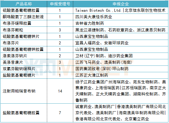 米内网数据显示,正在审评的抗炎药和抗风湿药一致性评价补充申请有13个品种,涉及受理号38个。其中,布洛芬颗粒、注射用帕瑞昔布钠、盐酸氨基葡萄糖胶囊申报企业有3家及以上,而注射用帕瑞昔布钠的申报企业数量最多,涉及恒瑞医药、齐鲁制药、奥赛康药业等8家企业,14个受理号。2018年在中国公立医疗机构终端,帕瑞昔布注射剂销售额近13亿元,原研药辉瑞的市场份额占比超过85%。然而谁能先拔头筹率先过评?我们拭目以待。