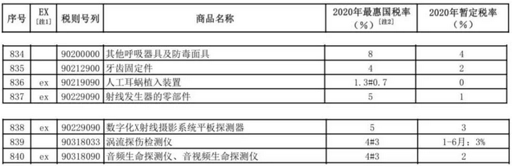 通知指出,2020年1月1日起,一批医疗器械实施进口暂定税率,包括人工耳蜗、呼吸器具等;