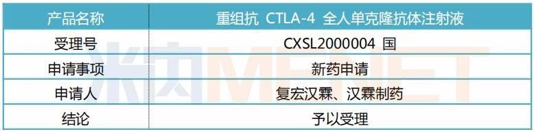 1月11日,复星医药发布公告称,控股子公司复宏汉霖及汉霖制药研制的重组抗CTLA-4全人单克隆抗体注射液用于无法切除或转移性黑色素瘤、晚期肾细胞癌、微卫星高度不稳定性或错配修复缺陷的转移性结直肠癌治疗以及黑色素瘤辅助治疗获国家药监局临床试验注册审评受理。