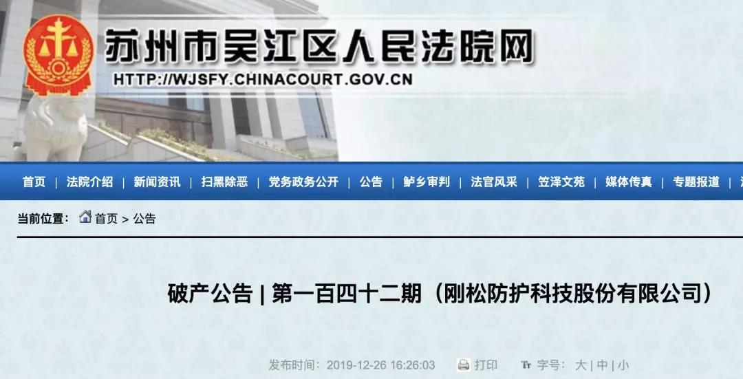 2019年12月26日,苏 州 市 吴 江 区 人 民 法 院发布了刚松防护科技股份有限公司(以下简称“刚松防护”)的破产公告,马上要进入破产清算程序。