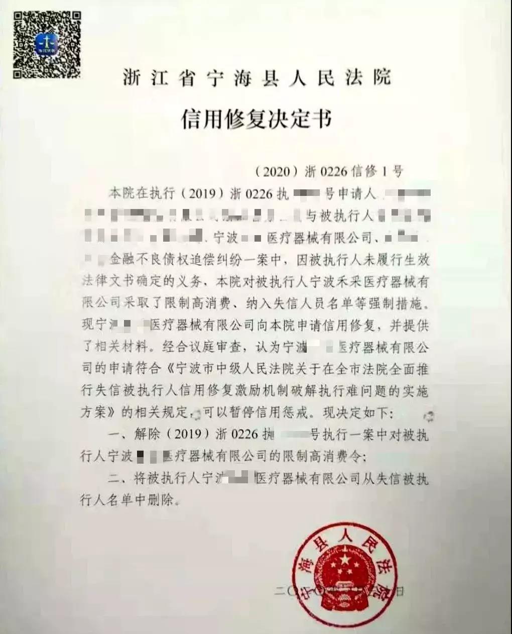 1月30日,浙江宁波某医疗器械有限公司在移动微法院上收到了浙江省宁海县人民法院发来的信用修复决定书,这意味着他们可以在这个特殊时期争取到更多的资金,加大生产、制造更多的医疗床、抢救车等医疗器械。