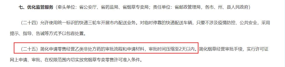 值得注意的是,湖北省在下发该《措施》时提及,是为了贯彻落实《国务院办公厅关于加快发展流通促进商业消费的意见》(国办发〔2019〕42号)精神。而该意见第4条“加快连锁便利店发展”项也谈到,开展简化烟草、乙类非处方药经营审批手续试点。