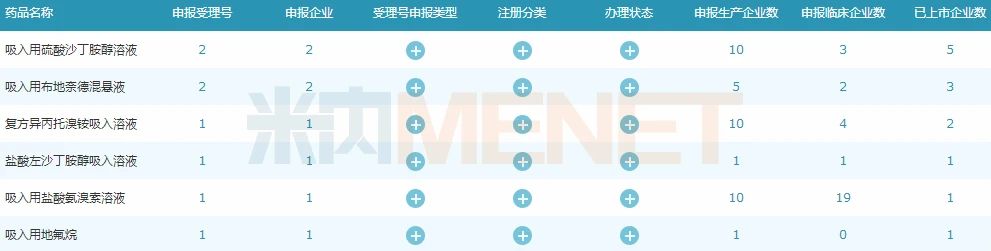 6个过评吸入剂中有5个为呼吸系统用药,吸入用硫酸沙丁胺醇溶液、吸入用布地奈德混悬液、复方异丙托溴铵吸入溶液、盐酸左旋沙丁胺醇吸入溶液均为抗哮喘药,吸入用盐酸氨溴索溶液为咳嗽与感冒用药;恒瑞医药的吸入用地氟烷为神经系统药物,用于麻醉诱导和麻醉维持。