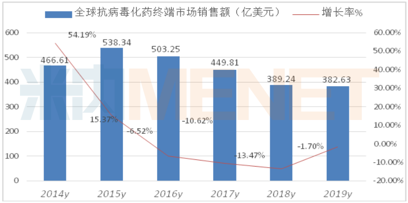 抗丙肝病毒药物Sovaldi于2014年独占鳌头拿下百亿美金市场,2019年已有14个抗丙肝病毒药物在市场上竞争,Sovaldi已成昨日黄花。2019年,全球抗丙肝病毒药物总体市场相比峰值年下滑75%的形势下,给全球抗病毒市场下滑做出了圆满的诠释。而抗流感病毒和抗HIV市场增长仍在提速。2019年全球抗流感病毒化药市场销售额14.93亿美元,同比上一年增长了62.81%,达到了近五年的峰值。在新冠疫情的漫延下,2020年将呈现出持续增长的可能性,主要品种是奥司他韦、辛酸拉尼米韦、扎那米韦、阿比多尔、利巴韦林。