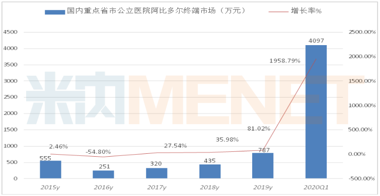 米内网数据显示,2020年一季度国内重点省市公立医院终端阿比多尔市场为4097万元,较上一年同期增长1958.79%。