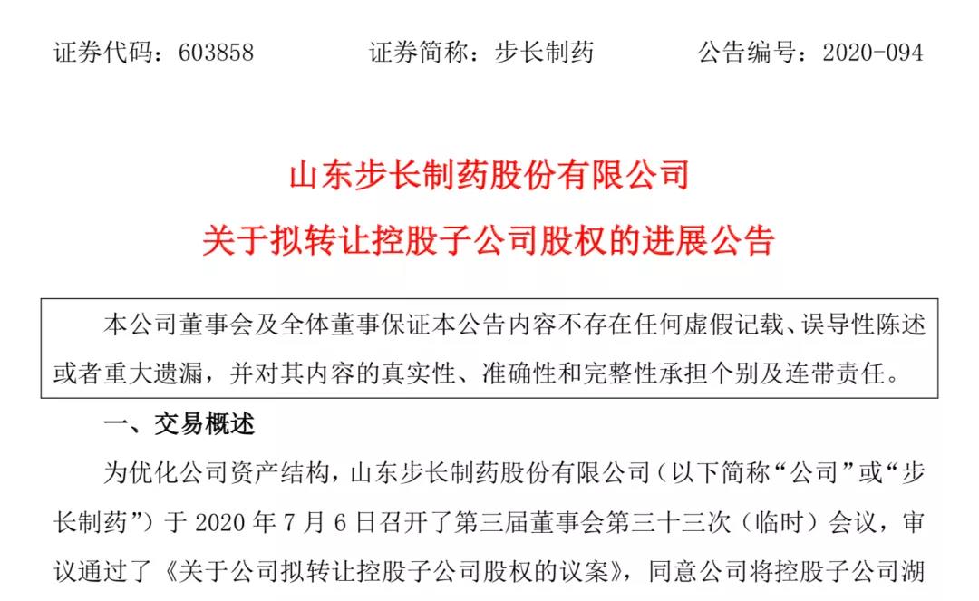 9月21日,山东步长制药发布进展公告,为优化公司资产结构,山东步长制药股份有限公司(以下简称“步长制药”)审议通过了《关于公司拟转让控股子公司股权的议案》,同意公司将控股子公司湖北步长九州通医药有限公司(以下简称“湖北步长九州通”)51%股权以2175.2万元转让给九州通医药集团股份有限公司(以下简称“九州通”)。