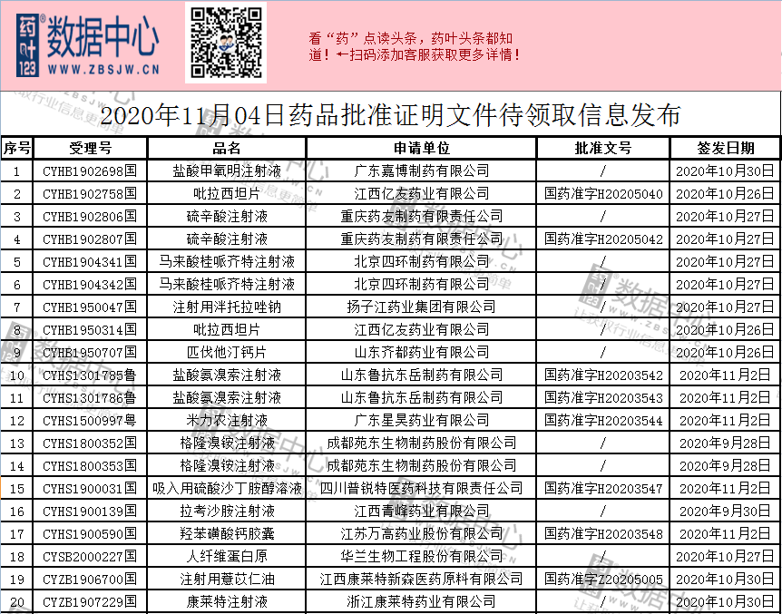 11月04日药品批准证明文件待领取信息发布,其中3个产品通过一致性评价;扬子江药业集团有限公司注射用泮托拉唑钠,继奥赛康后第2家过评企业;东生物格隆溴铵注射液国内第2家重磅获批。