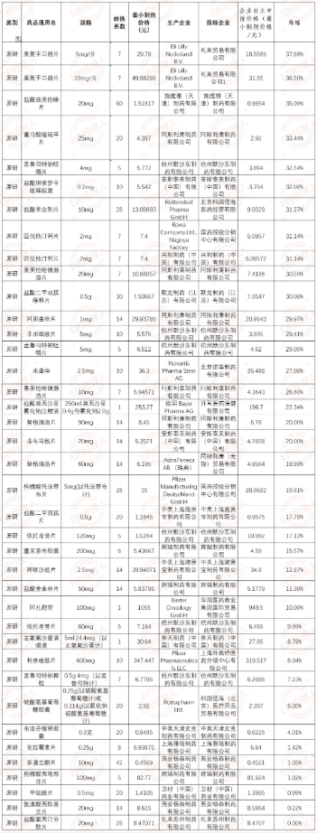 降幅最大的为礼来的奥氮平口崩片,降幅近38%,此外降幅较大的还有施维雅的盐酸曲美他嗪片、阿斯利康的富马酸喹硫平片、默沙东的孟鲁司特钠咀嚼片等,降幅都在30%以上。