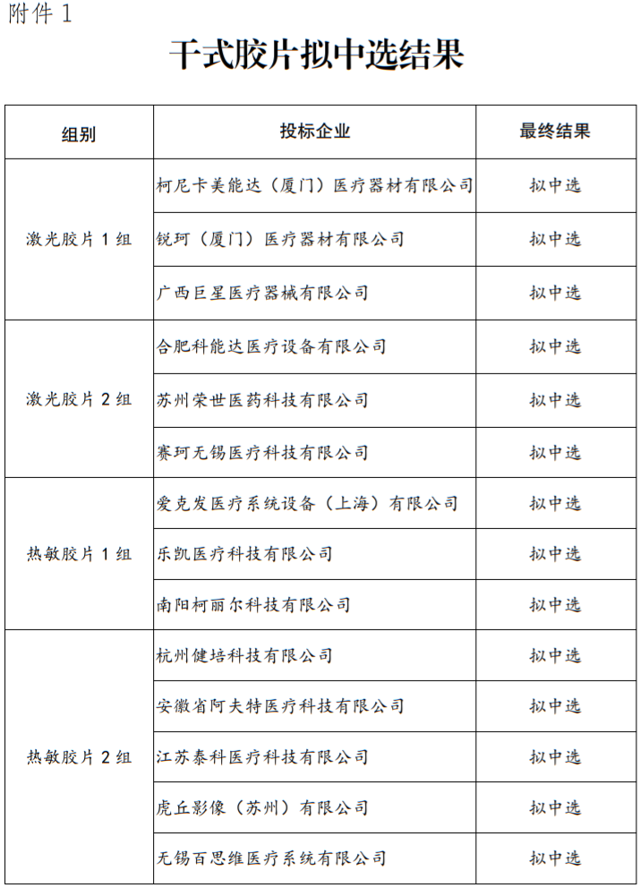 干式胶片拟中选械企包括柯尼卡美能达、锐珂、广西巨星等。