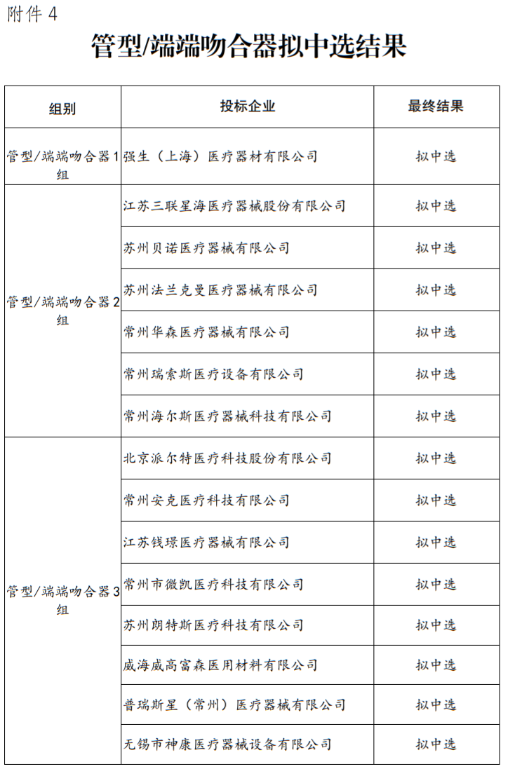 管型/端端吻合器拟中选械企包括强生、江苏三联星海、威海威高富森、北京派尔特等;