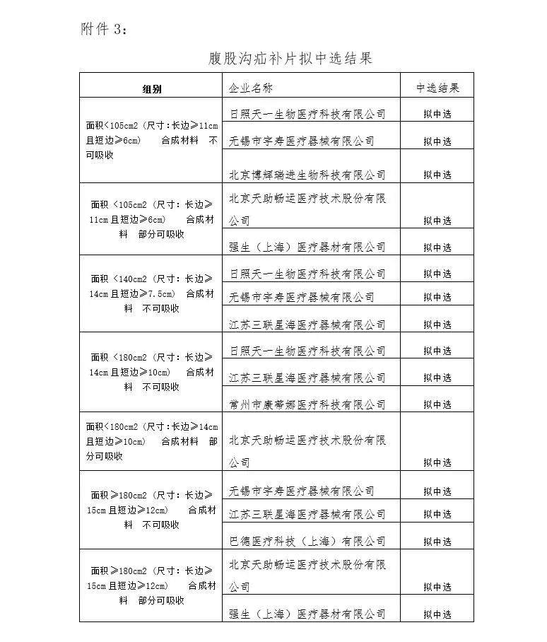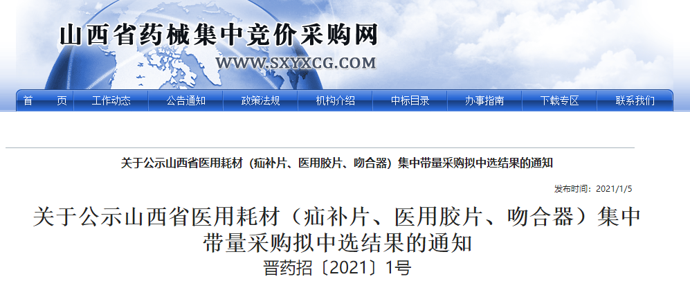 日前(1月5日),山西省药械采购网最新发布了一则《关于公示山西省医用耗材(疝补片、医用胶片、吻合器)集中带量采购拟中选结果的通知》(以下简称《通知》)。