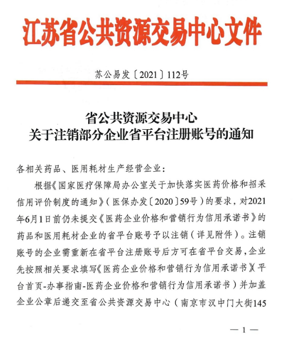 近日,江苏省药械招标采购服务中心发布了《2021年江苏省公共资源交易中心关于注销部分企业省平台注册账号的通知》。