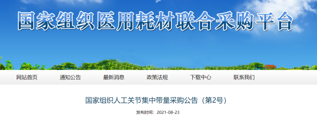 国家组织医用耗材联合采购平台发布了两则通知,一则是《关于召开国家组织人工关节集中带采购企业培训会的通知》,定于2021年8月26日(周四)召开企业培训会。另外一则是关于《国家组织人工关节集中带量采购公告(第2号)》。