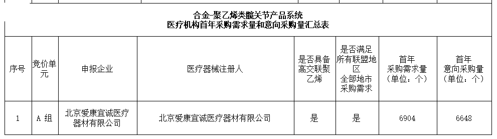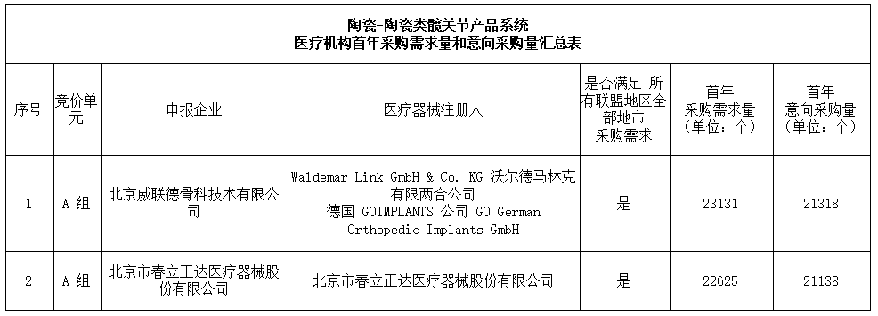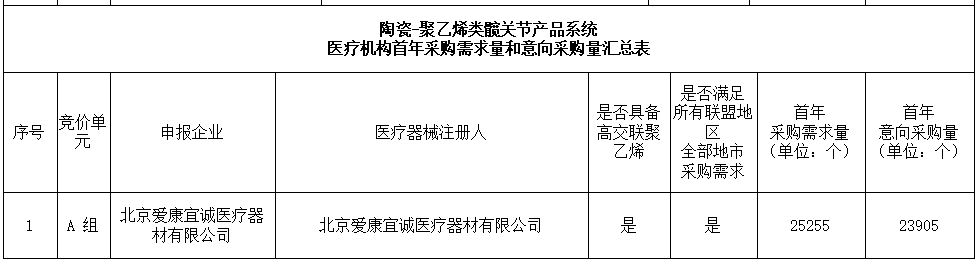 髋关节产品系统首年意向采购总量为:305542 个(其中,陶瓷-陶瓷类髋关节产品系统:126797 个,陶瓷-聚乙烯类髋关节产品系统:142757 个,合金-聚乙烯类髋关节产品系统:35988 个);