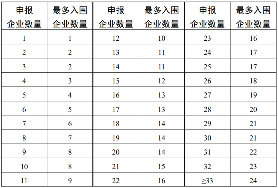 入围企业的产品系统竞价比价价格不高于最高有效申报价。同一竞价单元最多入围企业数量详见下表。