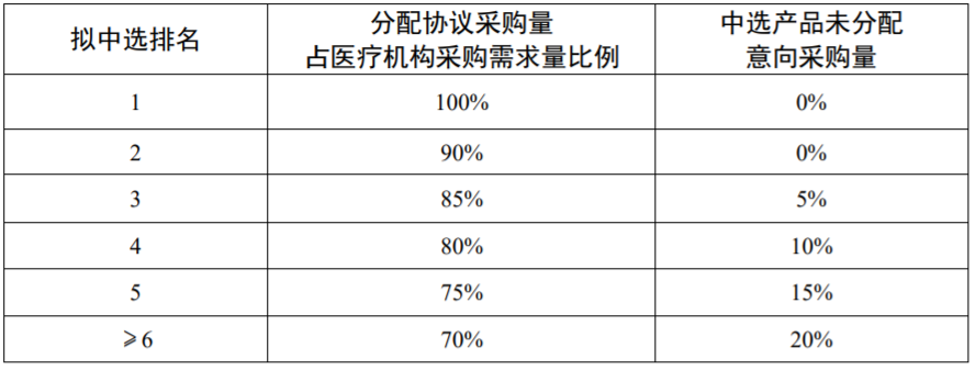 同一竞价单元中选企业按中选排名顺序,分配协议采购量(详见下表)。