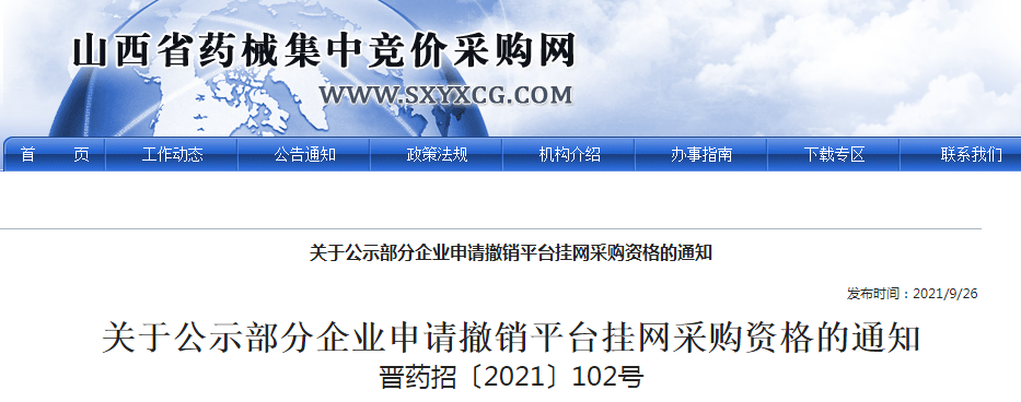 据山西省药械集中竞价采购网消息,因企业申请,依据山西省医疗保障局等部门《关于进一步做好药品和医用耗材挂网采购省际动态联动工作的通知》(晋医保发〔2020〕18号)相关规定,江苏正大清江制药有限公司等26家药品生产(经营)企业48个药品品规,申请撤销平台挂网采购资格,上述企业产品撤销挂网后两年内不接受该产品再次挂网。