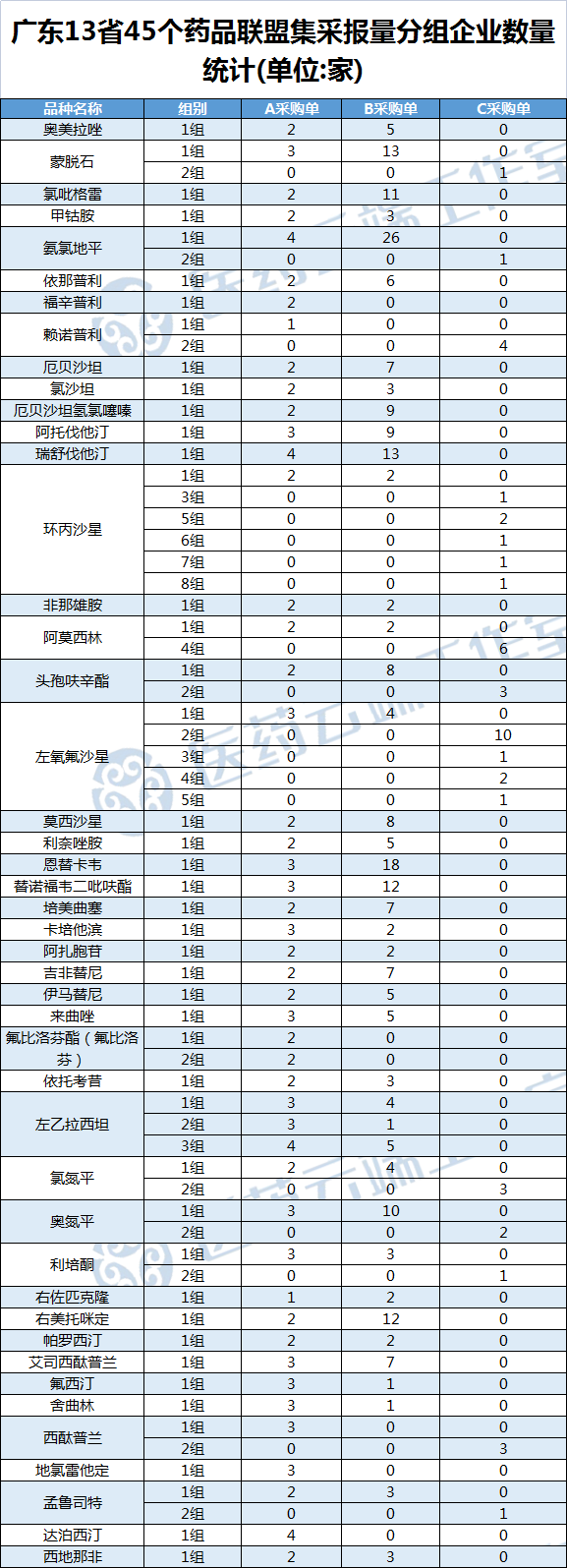 目前广东13省联盟集采A、B、C组竞争格局如下表所示。