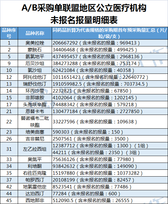 从公布的A/B采购单公立医疗结构报量明细表来看,还是有不少企业放弃了这块市场的竞争。根据采购规则,这些企业相关品种后续只能自主备案采购,而总采购量不得超过公立医疗机构总采购金额的5%。