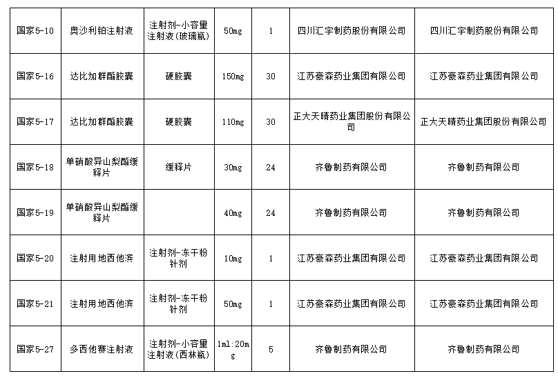 据梳理发现,此次承诺供应的30个药品中,有27个为第五批全国药品集中采购品种,两个为黑龙江“八省二区”药品带量采购品种,一个为京津冀“3+N”联盟药品联合带量采购的品种。品种包括阿昔洛韦片、奥沙利铂注射液、单硝酸异山梨酯缓释片、盐酸罗哌卡因注射液、注射用阿奇霉素、吲达帕胺缓释胶囊、注射用谷胱甘肽等,涉及的生产企业包括四川科伦药业、四川汇宇制药、江苏豪森药业、正大天晴药业、广东嘉博制药等。具体详情如下: