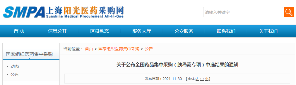11月30日,上海阳光医药采购网发布关于全国药品集中采购(胰岛素专项)中选结果的通知,正式公布第六批集采中选结果以及供应清单。