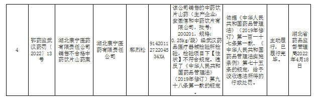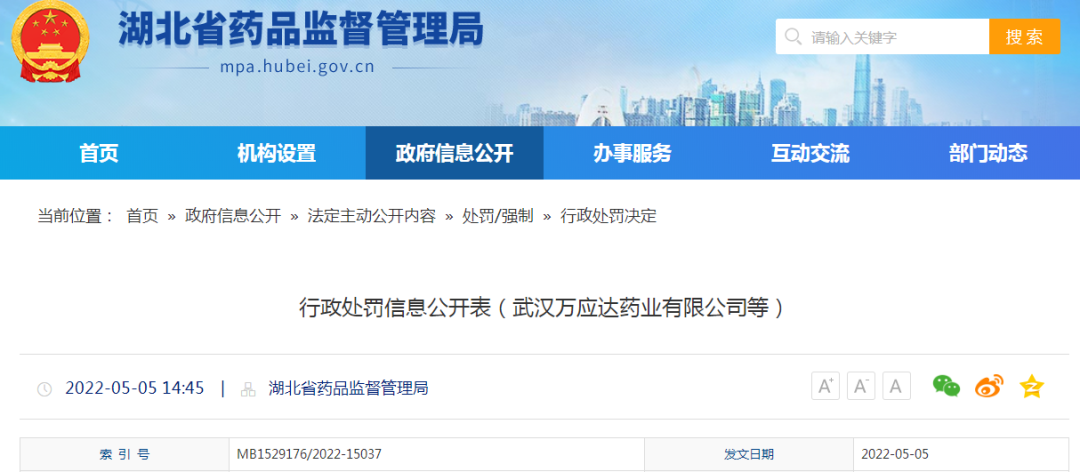 5月5日,湖北省药监局也发布了一则行政处罚决定,共计4家药企被公示处罚。