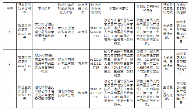 梳理处罚内容发现,武汉万应达药业有限公司、湖北南药新达药业有限公司、湖北祥林医药有限公司均因为未遵守药品经营质量管理规范被处罚,湖北康宁医药有限责任公司则是销售不合格中药饮片山药被罚。除了康宁医药仅被没收违法所得,其余三家企业全部处以罚款的处理,罚款金额虽未公开,但从处罚依据可以发现,这三家企业均属于逾期不改正的情形,涉及的罚款金额应在十万元以上五十万元以下的范围。
