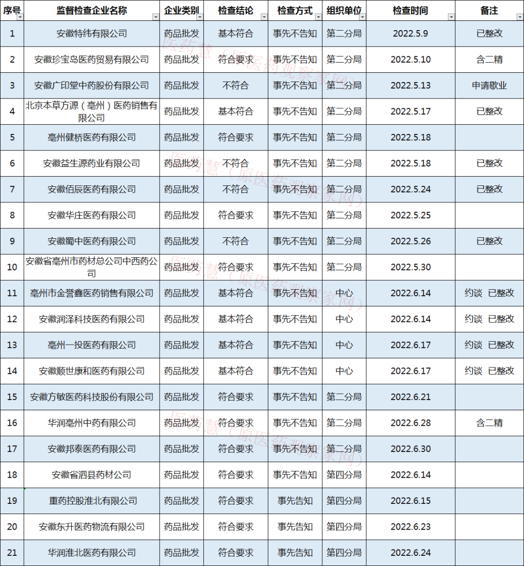 7月7日,安徽省药监局第二、第四分局发布了药品流通监督检查信息公告。共计21家企业接受了飞检和常规检查。