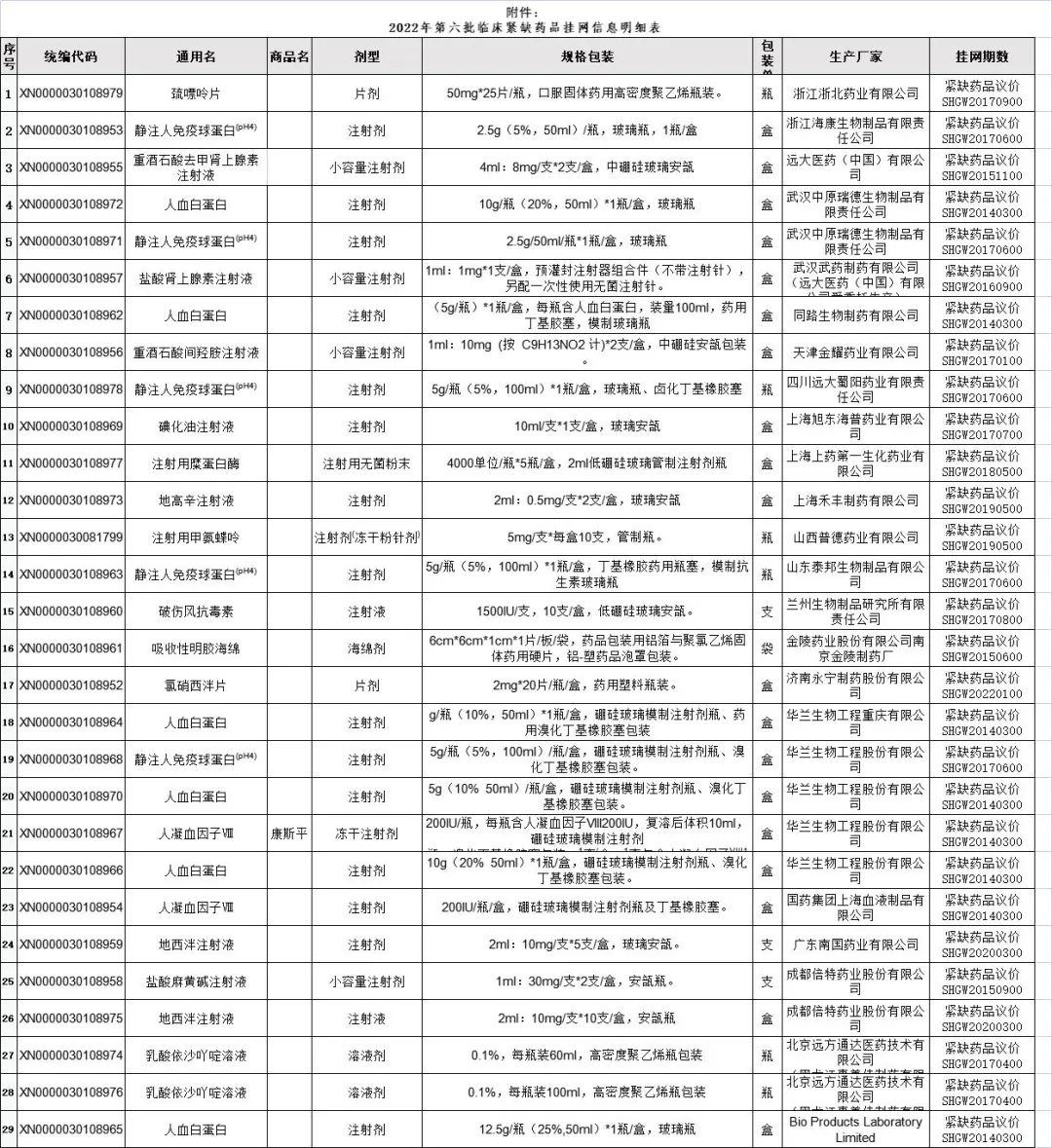 第六批29个临床紧缺药品挂网信息公示(含目录) |