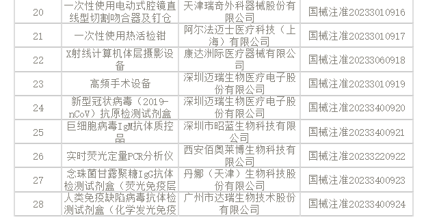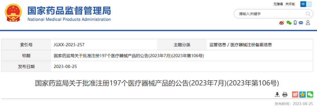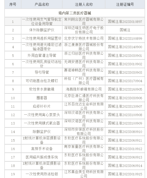 8月25日,国家药监局发布公告,2023年7月国家药监局共批准注册医疗器械产品197个。 其中,境内第三类医疗器械产品150个,进口第三类医疗器械产品21个,进口第二类医疗器械产品21个,港澳台医疗器械产品5个。 涉及深圳迈瑞的体外除颤监护仪、高频手术设备等,东软医疗的X射线计算机体层摄影设备、医用磁共振成像系统等,佳能医疗器械(大连)有限公司的X射线计算机体层摄影设备,乐普医疗的冠脉造影图像血流储备分数计算软件等。 2023年7月批准注册医疗器械产品目录
