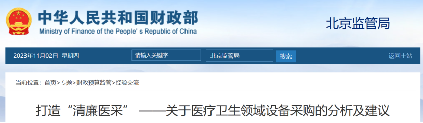10月30日,财政部官网分享文章《打造“清廉医采”——关于医疗卫生领域设备采购的分析及建议》。