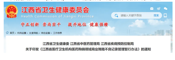 近日,江西省卫生健康委、江西省中医药管理局、江西省疾病预防控制局三部门联合发布关于印发《江西省医疗卫生机构医药购销领域商业贿赂不良记录管理暂行办法》的通知(下称《通知》),自2024年7月1日起开始施行。